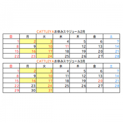 いつもCATTLEYA美容室を ご利用いただきありがとうございます☻2月3月のお休み表です。黄色いと…